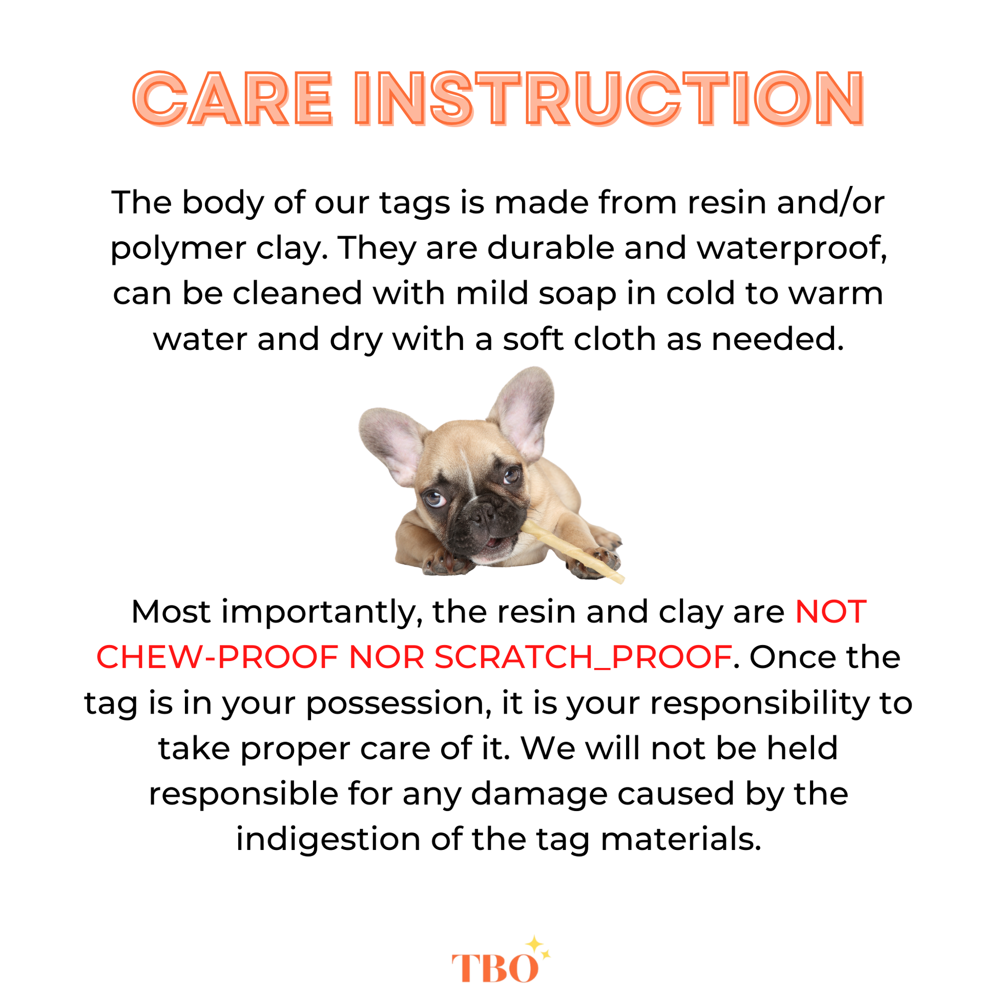 Please note that resin and polymer clay tags are NOT chew-proof or scratch-proof. Once the tag is in your possession, proper care becomes the responsibility of the owner. We are not responsible for any harm caused by the ingestion of tag materials.